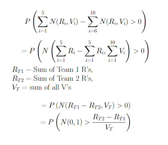 Now here comes some math. If players 1-5 are on team 1 with performance ratings of R1, R2, … , R5 and volatilities V1, V2, … , V5 and players 6-10 are on team 2 with similarly labeled ratings and volatilities, then we can say that the expected outcome is predicted by the probability that the difference of the sum of the distributions of ratings of each team is greater than 0. Alternatively: P(Sum(N(Ri, Vi), i = 1 to 5) - Sum(N(Ri, Vi), i = 6 to 10) > 0) is the probability that team 1 wins. Doing a bit more math:
