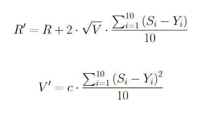 This sets R’ as R shifted two standard deviation times the mean outcome delta and V’ as the variance of outcome times a constant, c (which just has to be greater than 0). This helps account for win/loss streaks as a high discrepancy in performance vs expectation will result in larger shifts.