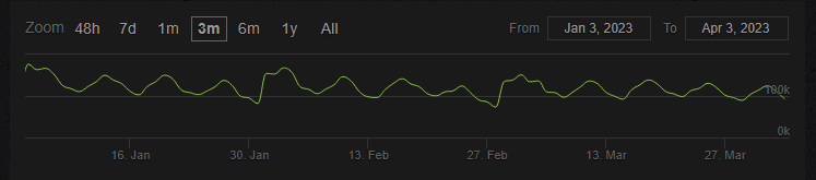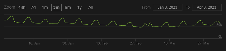 Compare this with Ark, which doesn’t wipe. We do see spikes in players, however these are all for the weekend and immediately fall off when the week starts again. This cycles are much less gradual than the ones for Rust and do not maintain the player count long-term as well, which can be seen in the actual player count numbers for both games. Despite both games having roughly 245k peak players, (as of April 2023) Rust currently has a 30-day average of about 82k players while Ark has a 30-day average of about 44k players. This shows the power of wipes in keeping players playing long term.