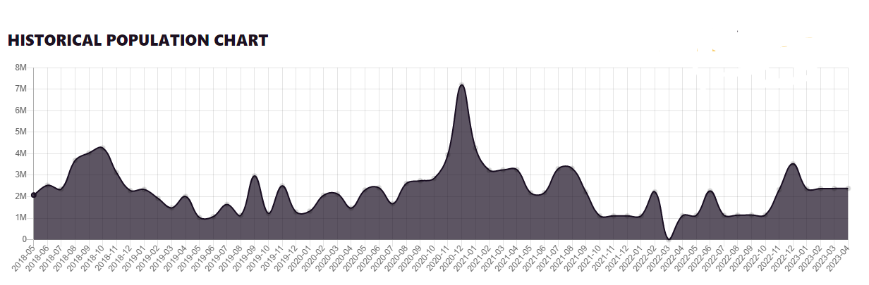 World of Warcraft’s three most recent expansions are: Battle for Azeroth (14 August 2018), Shadowlands (23 November 2020) and Dragonflight (28 November, 2022). Looking at the player population chart, we can see that there were large spikes in players right around the release of these expansions that dropped off as players completed the new content.