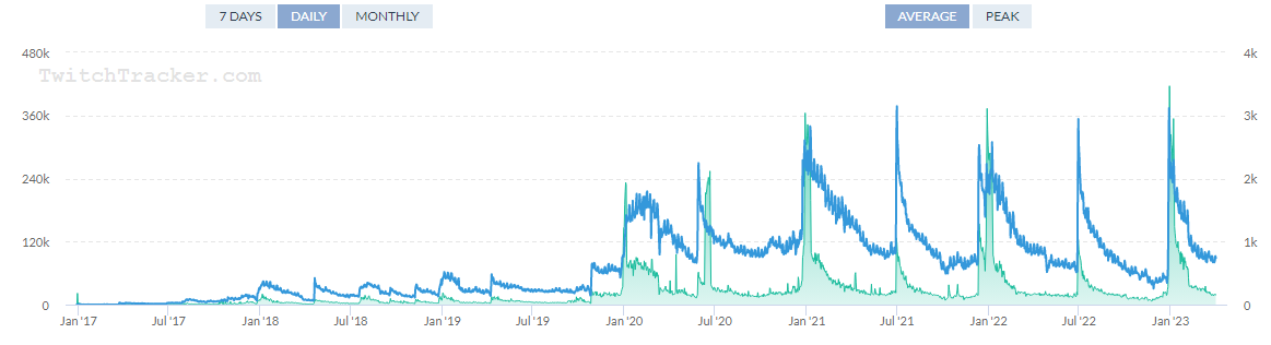 Tarkov wipes about every 6 months, and as can clearly be seen in the Twitch viewership, there is a massive spike every wipe which rapidly drops off a bit after the wipe ends. However, these peaks continually keep increasing, indicating that the actual interest in the game is actually increasing. Of course, since these are viewership numbers and not player counts, they aren’t perfectly representative, but considering that (based on data from mmostats.com in April 2023) the peak daily player count of Tarkov is 233k, it’s likely that there are actually more players than viewers.